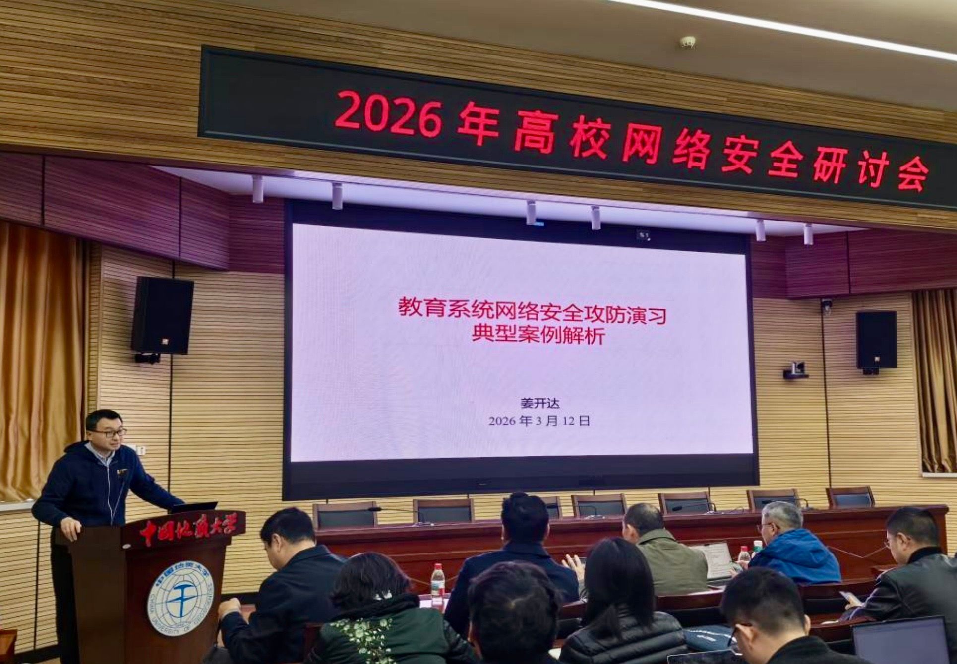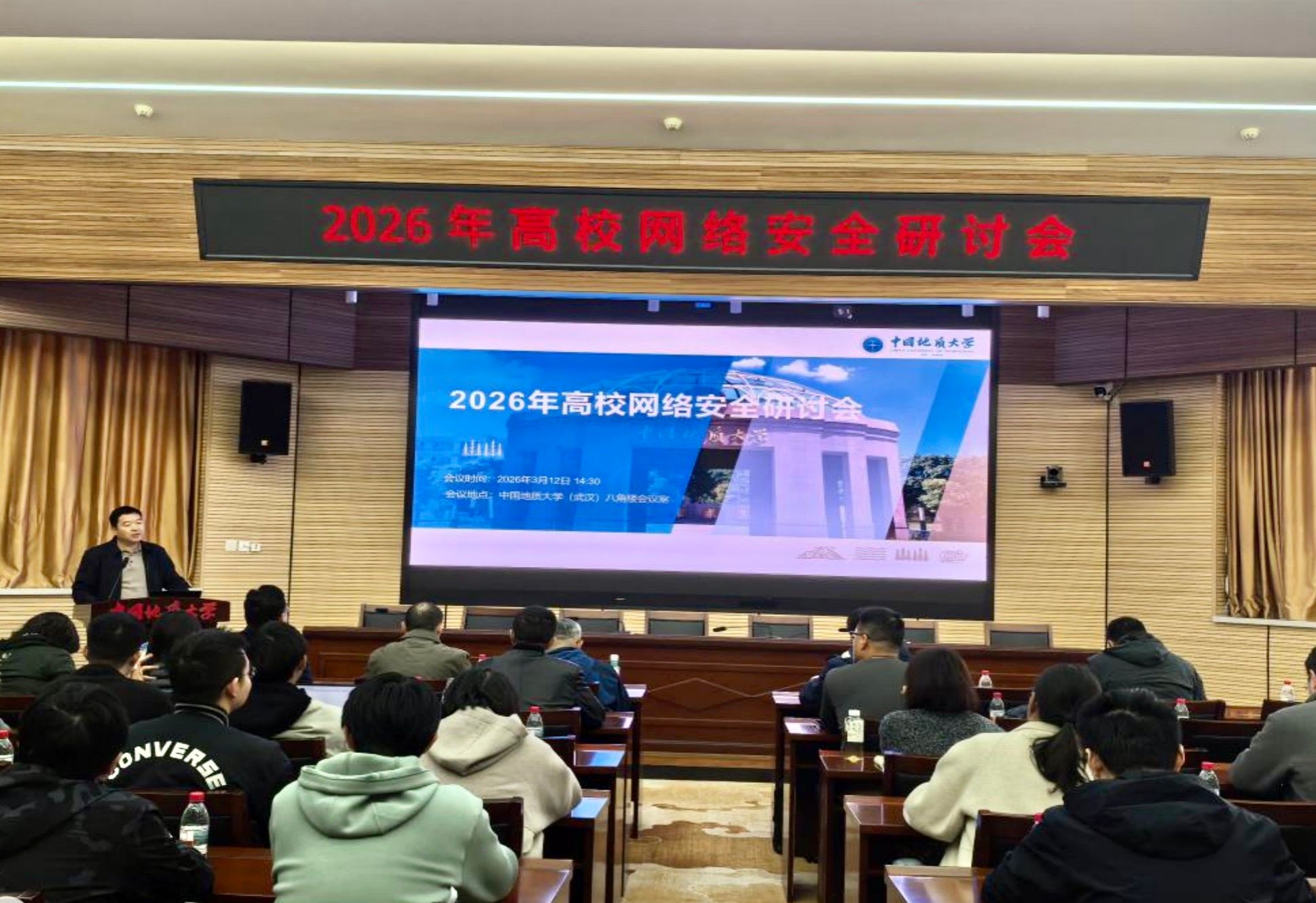 信息化工作办公室吴春明主任主持会议。当前,数字技术与高校各领域的融合程度较高,网络安全是学校实现高质量发展的底线要求。作为地处武汉的部属高校,学校严格落实教育部关于网络安全攻防演习的部署,深刻认识到网络安全形势的严峻性。筑牢校园网络安全防线,是保障学校健康稳定运行、实现高质量发展的核心支撑举措。他表示,举办本次研讨会的目的在于搭建交流学习的平台,破解高校网络安全工作中的难点与堵点,推动学校网络安全工作迈上新台阶。