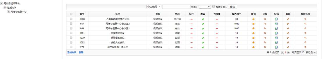 通过会议管理功能,管理员可以在总部门或者子部门下添加会议。点击“会议管理——添加会议”,即可实现会议的添加,将来新建会议可以参照以下描述与图片来创建会议。