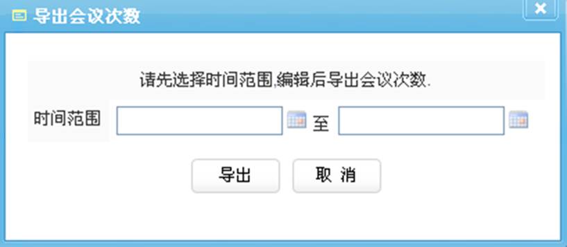 弹出导入的对话框,选择需要导出的时间范围,点击“导出”,系统自动将相关时间范围内所有的会议次数统计出来。导出的会议信息包括“会议室名称、会议主题、参会人数、开会次数”等。