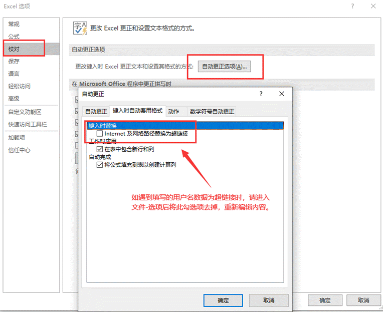 如果遇到填写的用户名Excel识别为超链接导致用户导入失败时,可以进入Excel的“文件”-“选项”内参照下图修改设置后重新编辑。