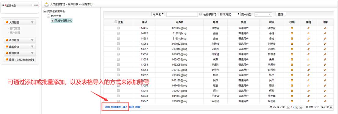 注:由于等保安全要求,通过网页添加或批量添加用户时,密码要求为字母、数字、特称字符组合的形式。而地大视讯网络会议系统所有账号均以工号为密码,所以我们需要通过表格导入的形式进行账号导入。