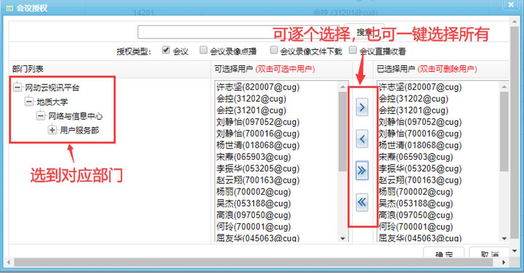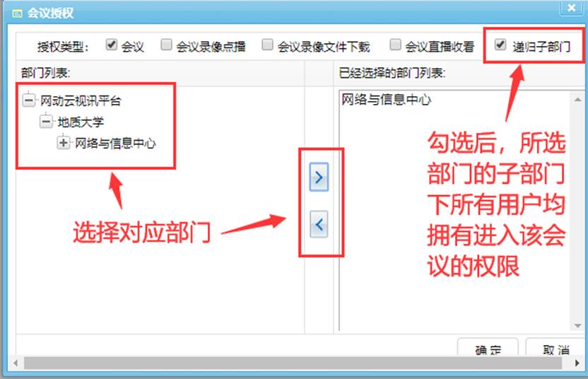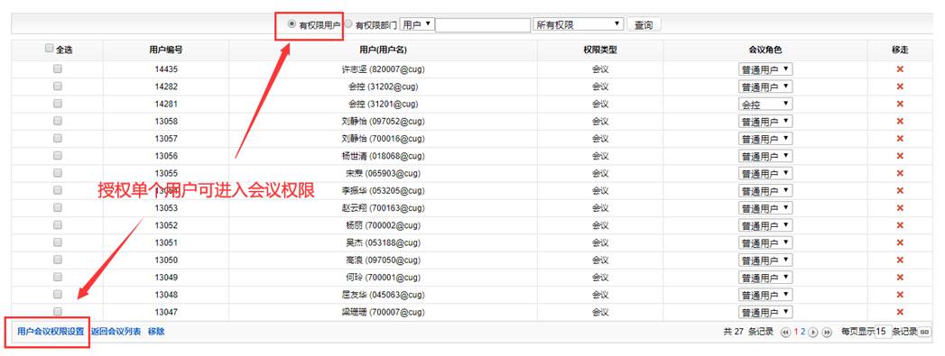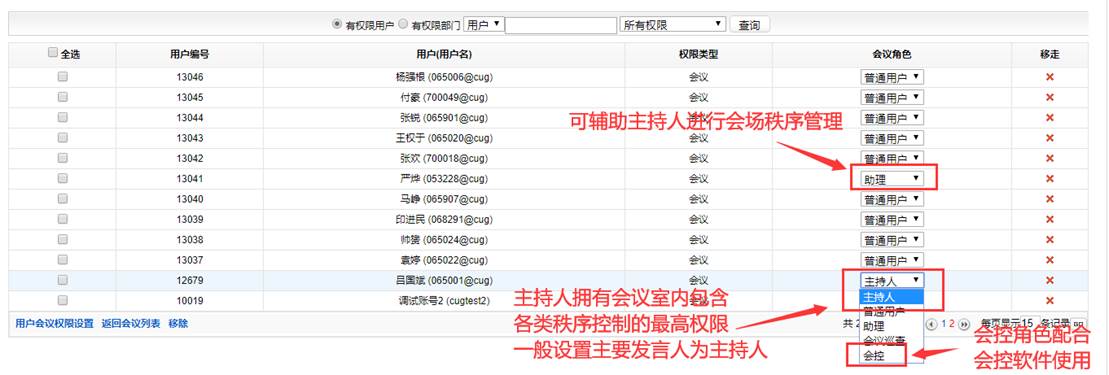 按钮,可以授权某用户或某部门进入此会议室,同时可以设置用户角色,可以删除某用户,角色分主持人、普通用户、助理及会控。