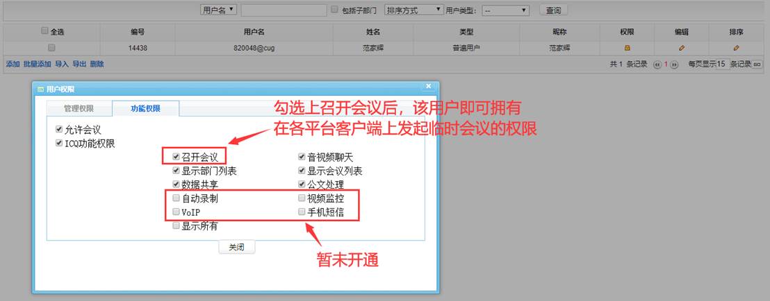 在功能权限中,如果将“召开会议”权限勾选,用户即可在客户端发起临时会议。