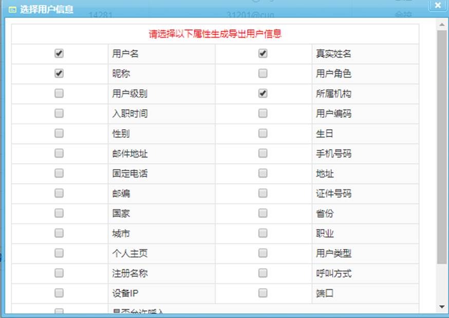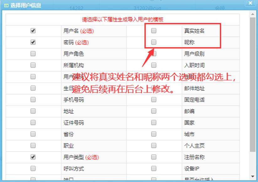 点击下载后进入用户信息选择,按下图所示选择各项信息用于导入用户模版,确定后保存模板文档到本地。