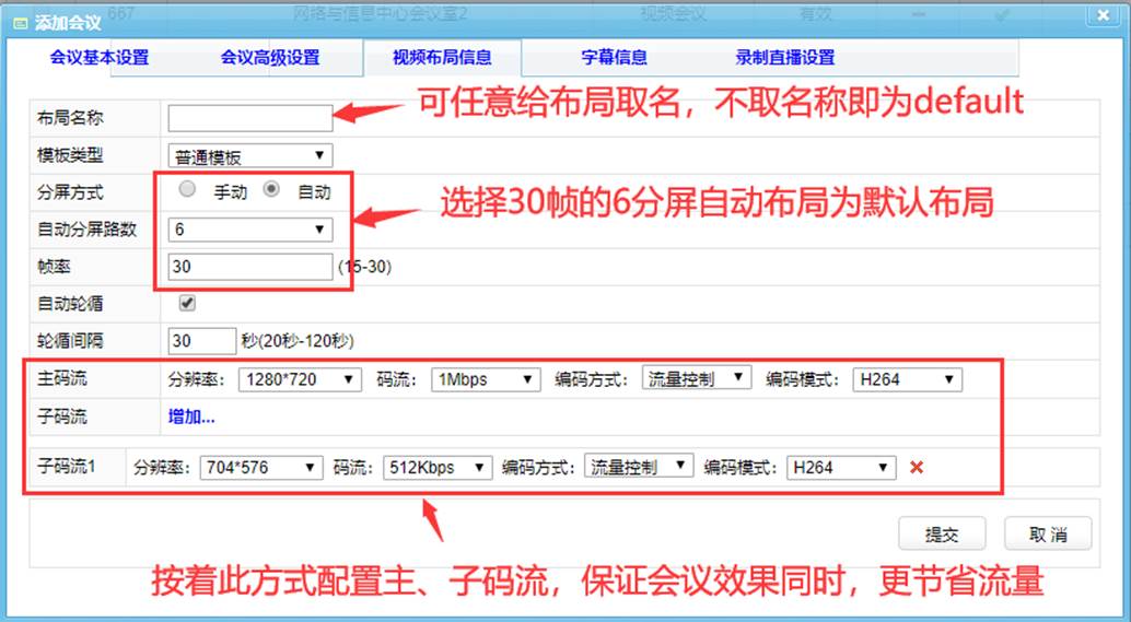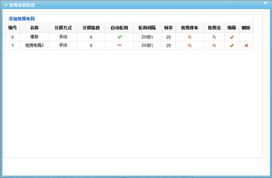 【视频布局信息】:设置模板名称、分屏方式、分屏路数、帧率、轮询、码流等内容。