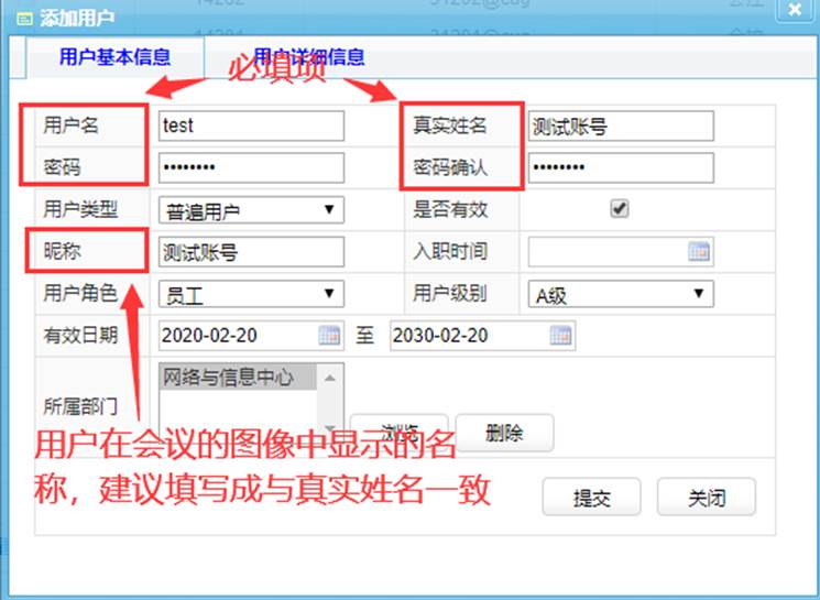 【添加】:点击“添加”可以添加一个用户,添加过程中有用户基本信息与用户详细信息可以进行填写,其中“用户名、真实姓名、密码”是必填选项。如下图所示: