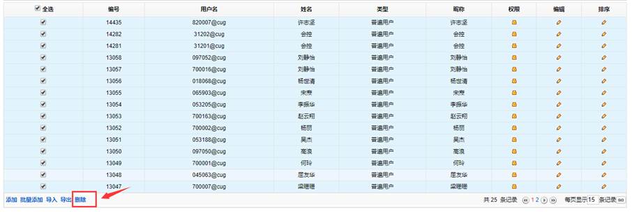 【删除】:如果想删除已添加成功的用户,点击用户编号前的复选框进行选择用户,然后点击删除按钮,确认后即删除所选用户。
