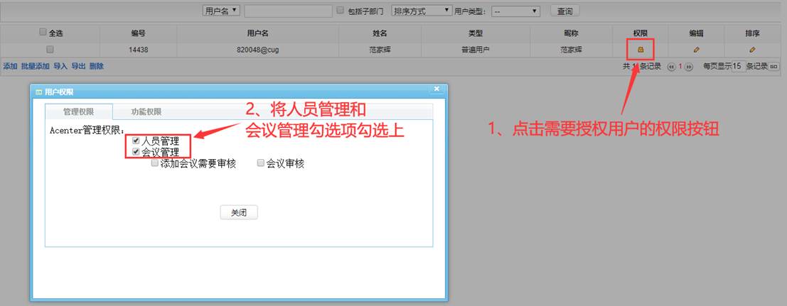 按钮,在管理权限中,可以授权此用户做部门管理员时的一些权限,例如对人员的管理、对会议的管理等。