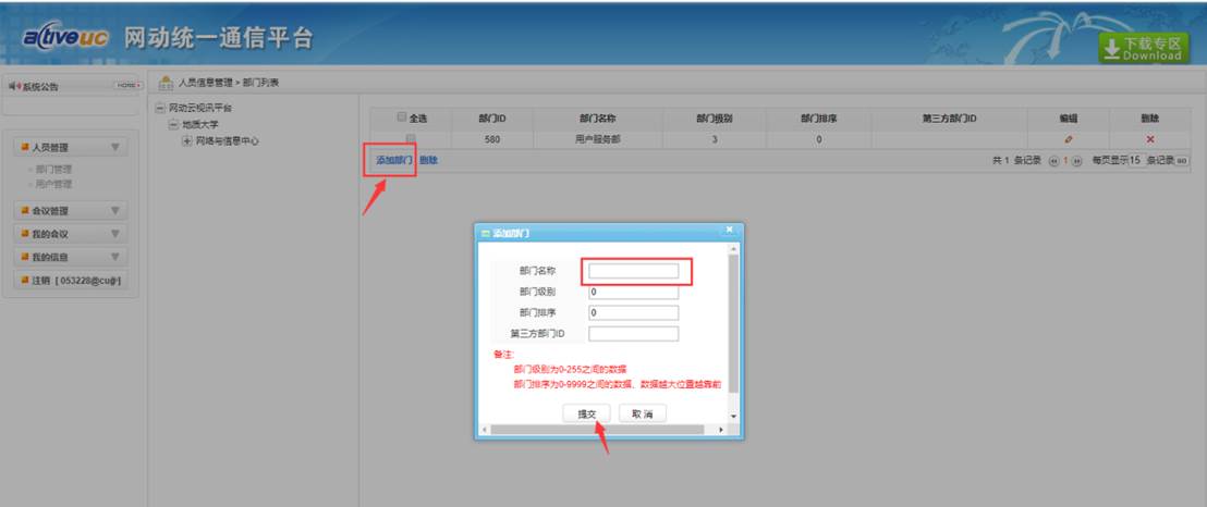【权限】:如需要在创建子部门,并需要设立子部门管理员时,可通过用户授权方式授予管理权限。点击用户列表权限下