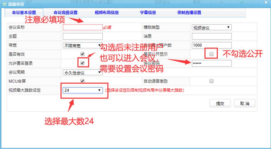 【允许匿名登陆】:勾选之后,允许未注册用户和已注册但未授权用户登陆此会议室。