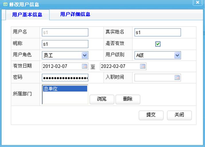 按钮,弹出修改用户信息对话框,可以对已存在的用户基本信息与用户详细信息进行修改。如下图: